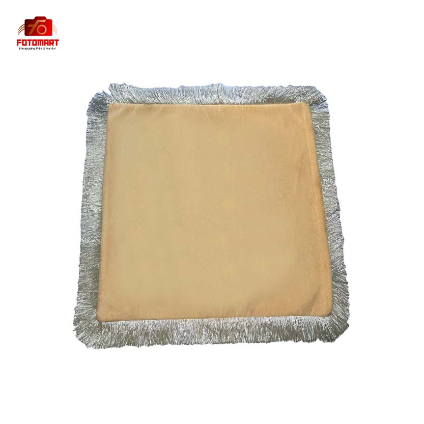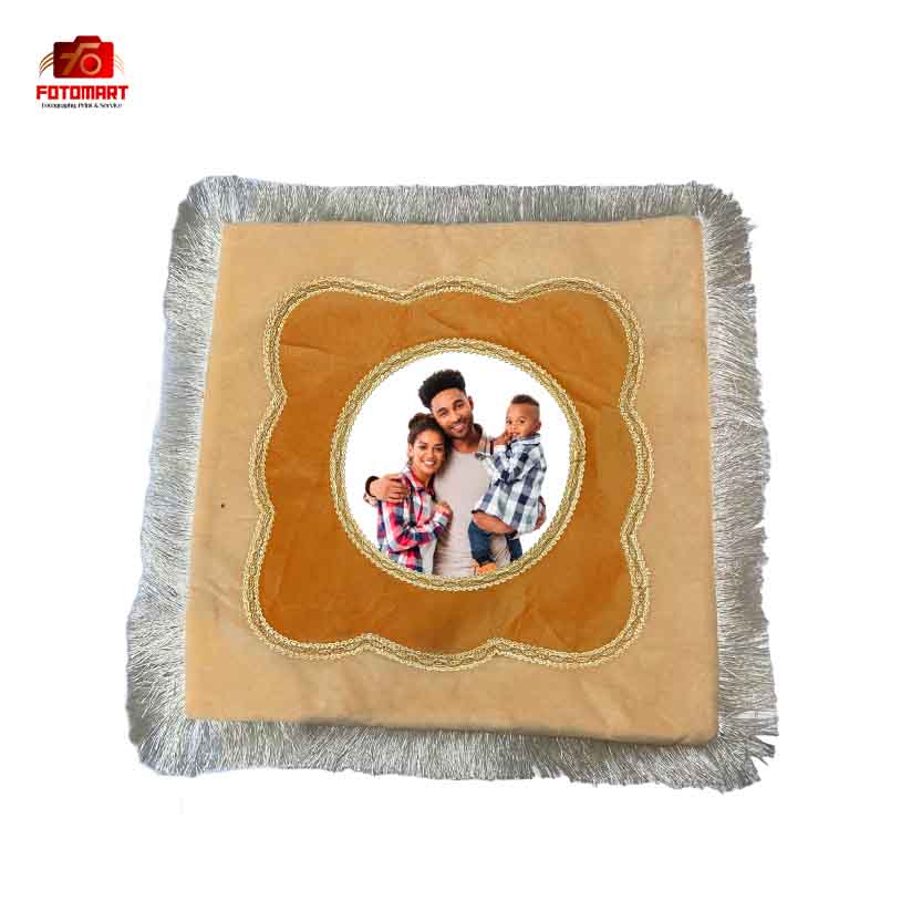 This velvet sublimation pad is specially designed for custom printing. Its smooth center panel allows for high-quality photo, logo or design transfers, while the surrounding luxurious velvet fabric and decorative gold embroidery with silver fringe give it an exclusive look.